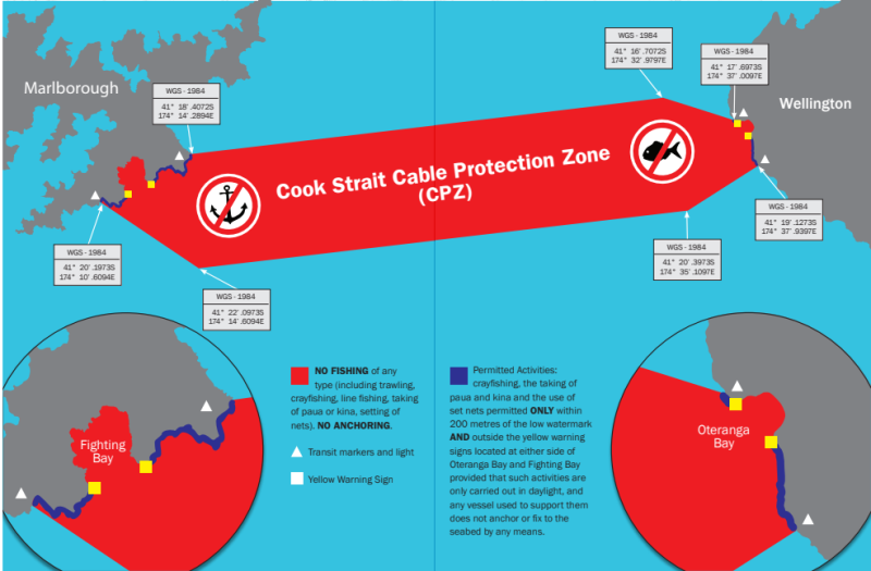 “The Cook Strait Cable Protection Zone exists to ensure our electricity supply is protected. The zone is an area of Cook Strait where no one can fish or put down an anchor – this is to ensure that the cables are not accidentally disturbed or damaged. Activities including fishing using nets, pots, lines, and diving are also prohibited.