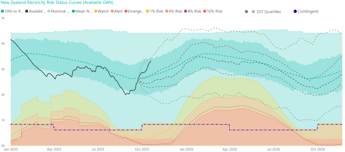extended periods of low inflows. - In this month's scenario we look at the impact on the ERCs if the third Rankine unit were to remain available in 2026, which is currently awaiting Commerce Commission approval. This lowers the NZ Watch curve by up to 931 GWh and results in four SSTs briefly crossing the Watch curve in 2026.
