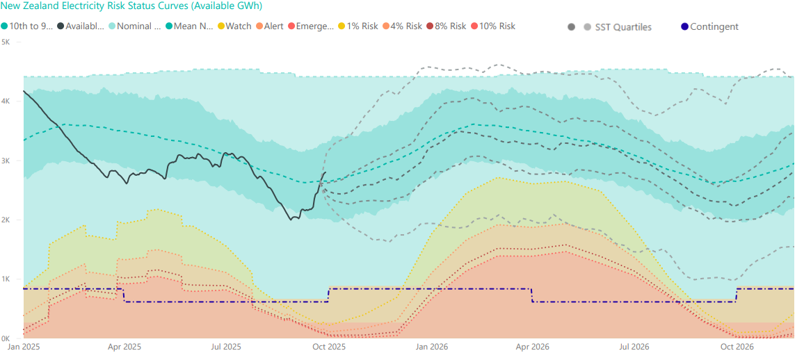 extended periods of low inflows. - In this month's scenario we look at the impact on the ERCs if the third Rankine unit were to remain available in 2026, which is currently awaiting Commerce Commission approval. This lowers the NZ Watch curve by up to 931 GWh and results in four SSTs briefly crossing the Watch curve in 2026.