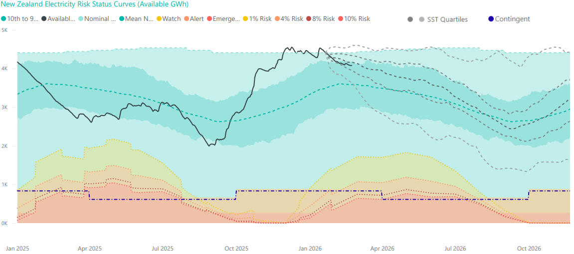 - No Simulated Storage Trajectories (SSTs) cross the Watch curve in 2026 or in 2027. This assumes the market supplements the existing coal stockpile at its maximum import capability to maintain increased thermal generation during any extended periods of low hydro inflows.