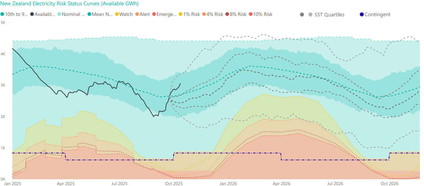 - The Electricity Risk Curves (ERCs) have lifted for most months in 2026 relative to the August update, predominantly due to a decrease in gas storage levels. There was little change to the risk curves for the remainder of 2025 when the curves are set by the Alert and Emergency floors reflecting energy held in contingent hydro storage.