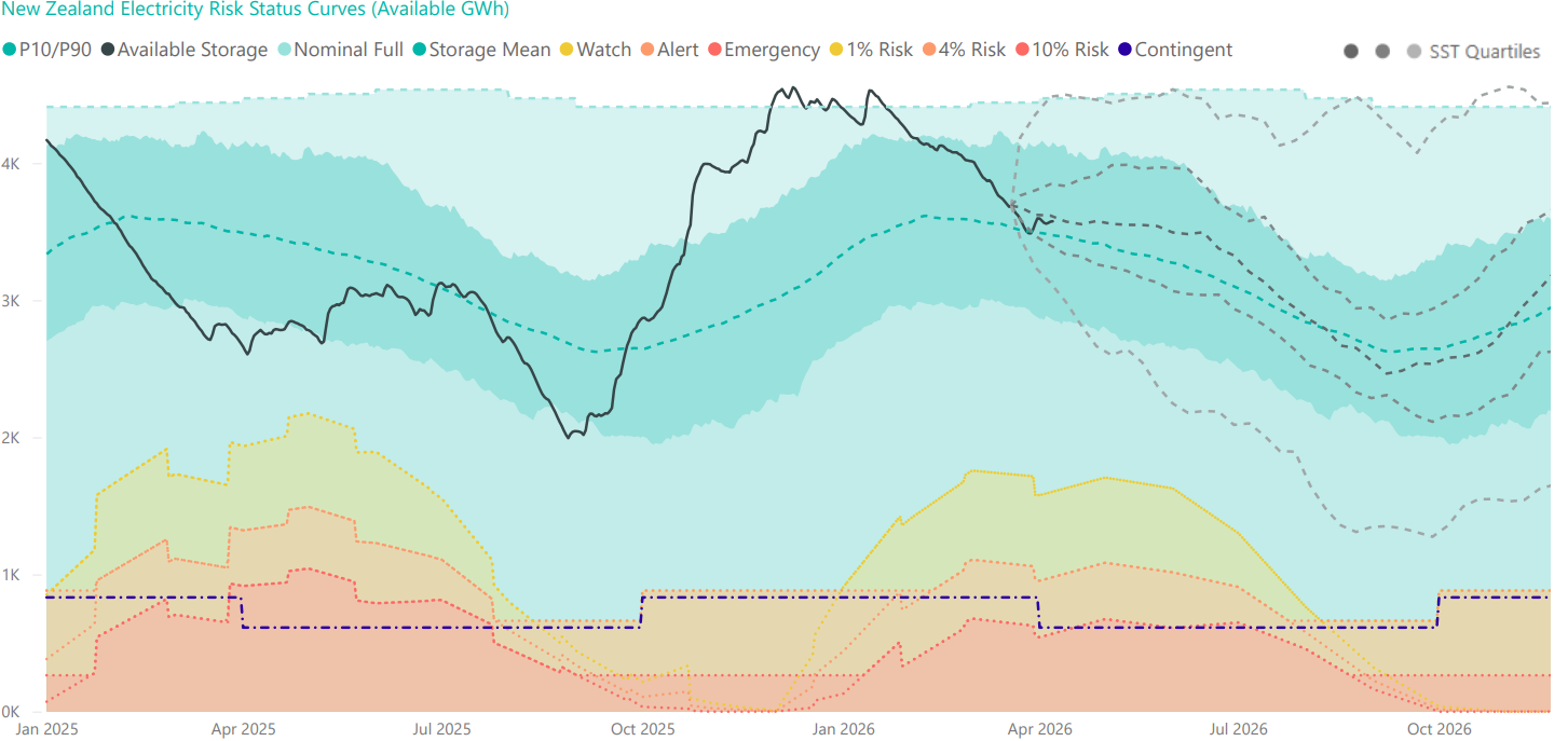 - NIWA has forecast in their seasonal climate outlook that below-normal rainfall is most likely for the west of the South Island over the next two months, which includes key hydro catchments. As we approach winter 2026, an ongoing focus on hydro storage management and ensuring sufficient backup thermal fuels and capacity remains necessary to mitigate the potential for very high prices.