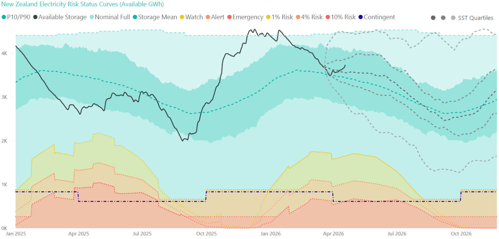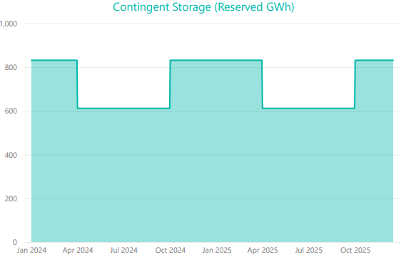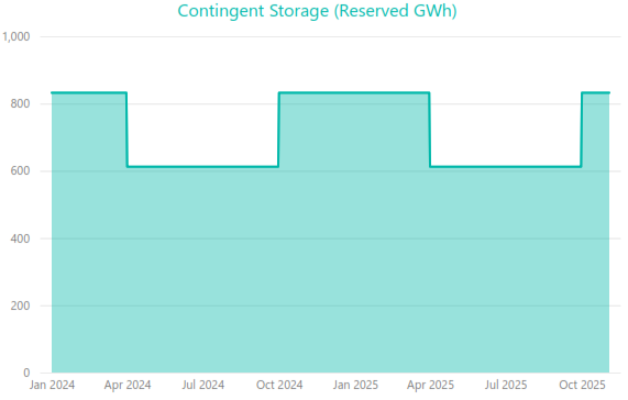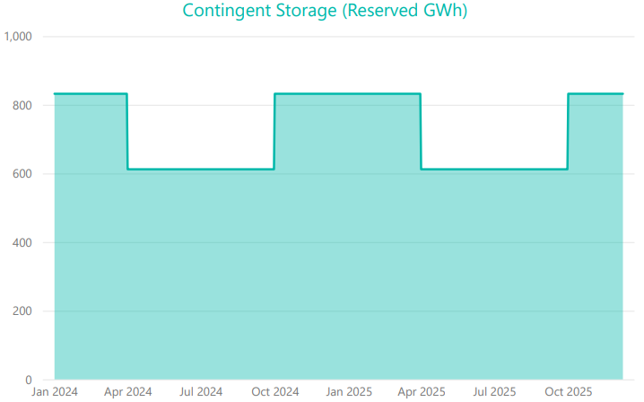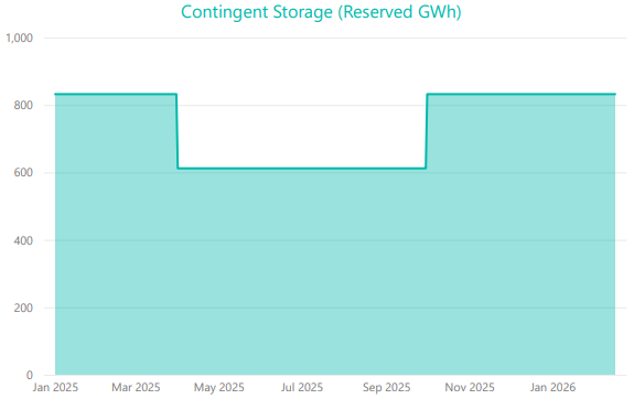 Contingent storage is stored hydro that is only made available for generation at specific times to mitigate the risk of shortage. Current available contingent storage is shown on the following graph.