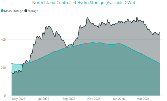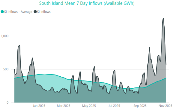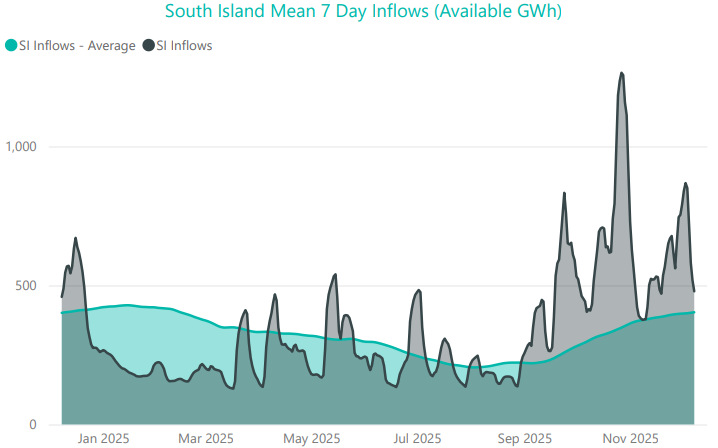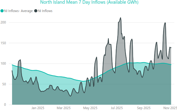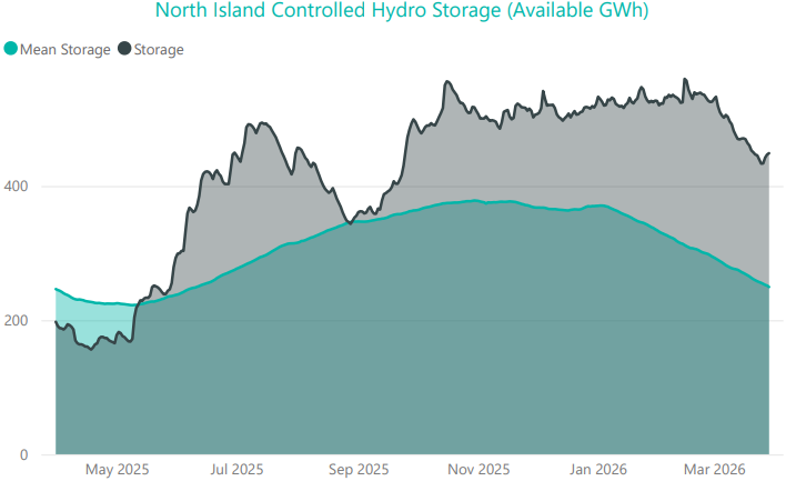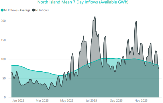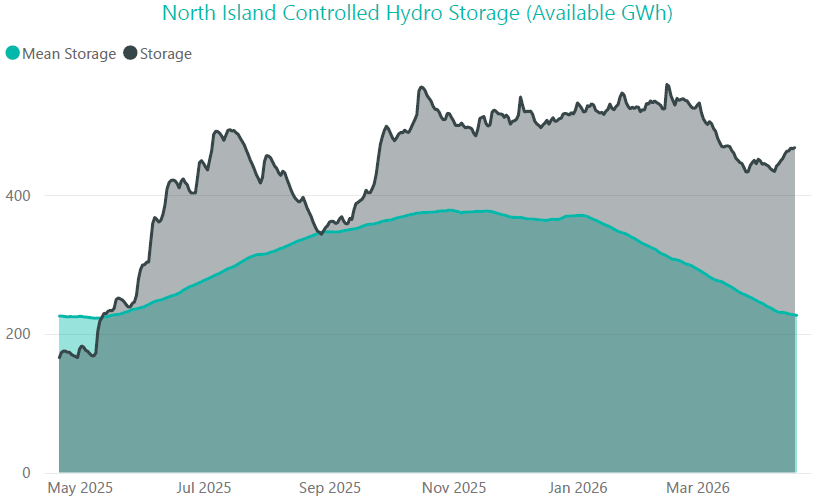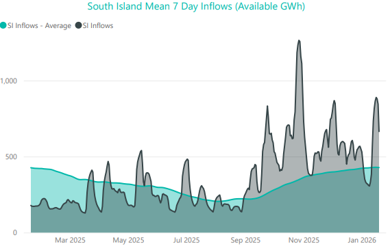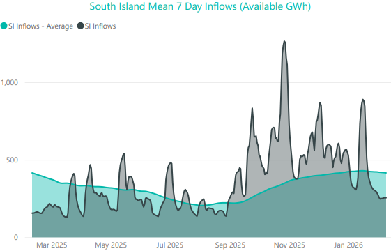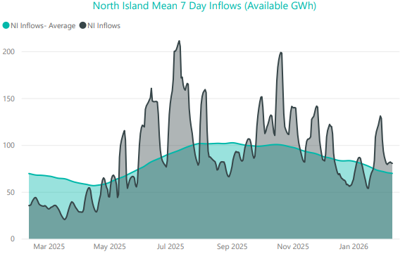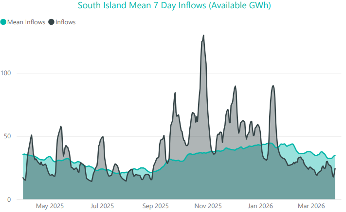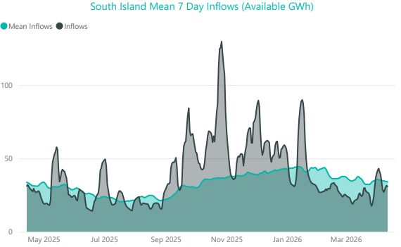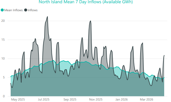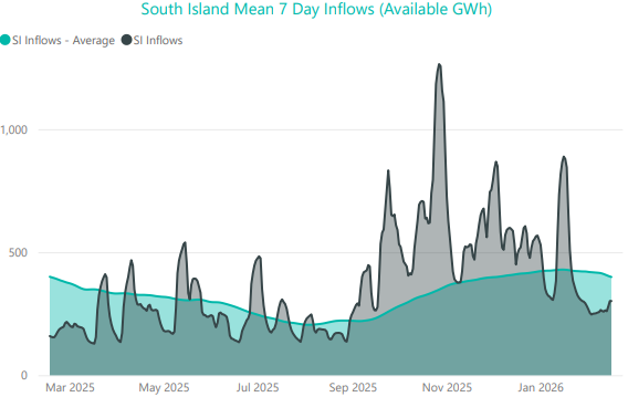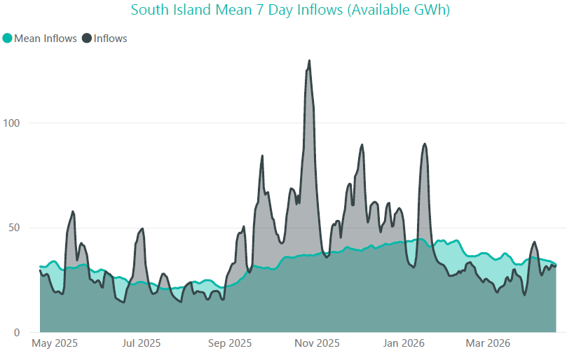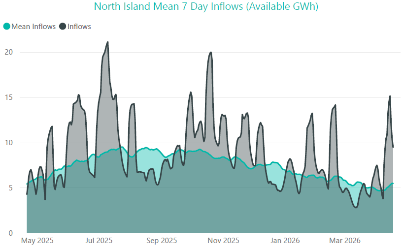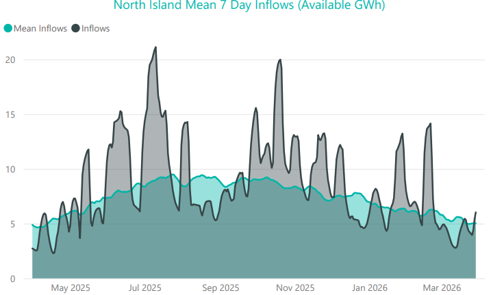 The charts below show storage over the last 13 weeks and rolling 7 day inflows for the last year in North and South Islands.