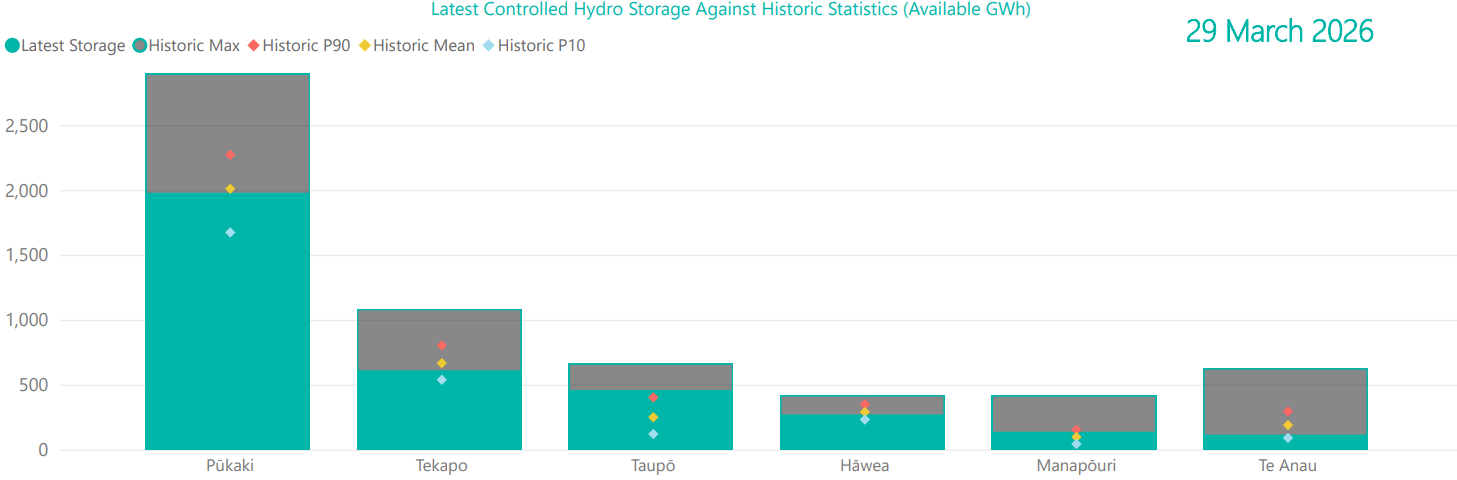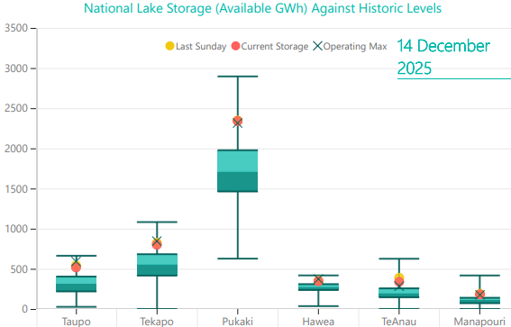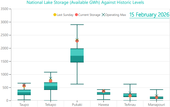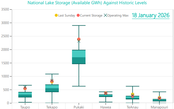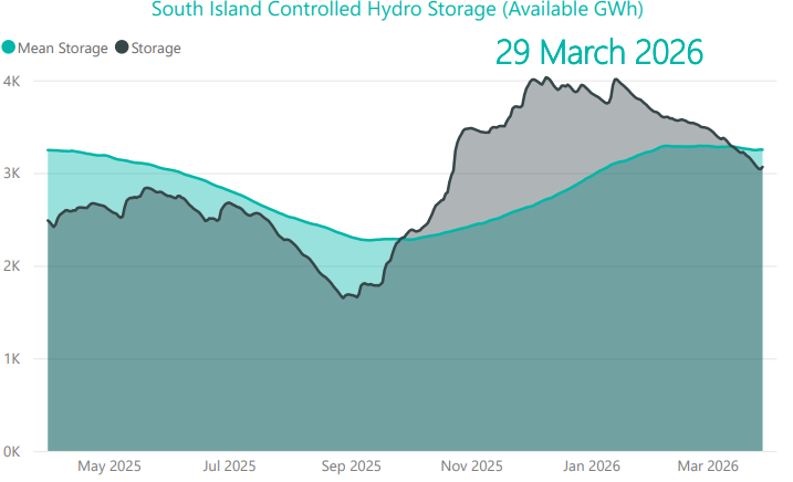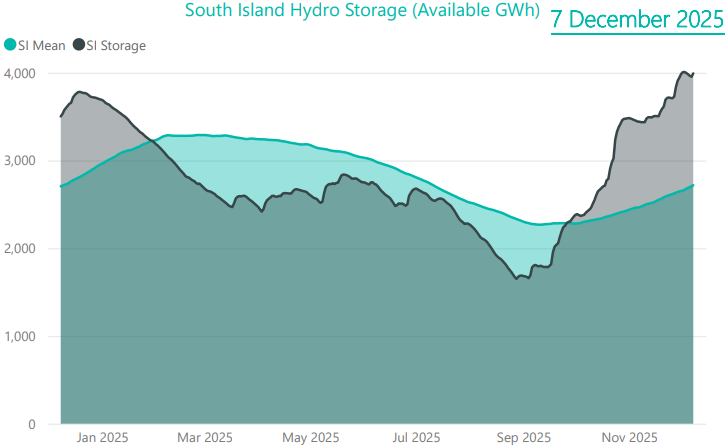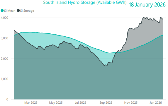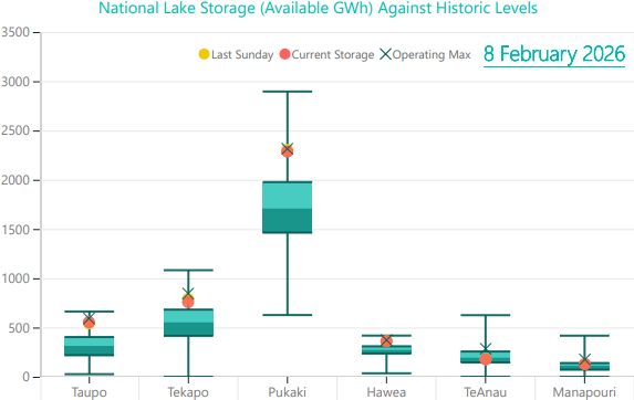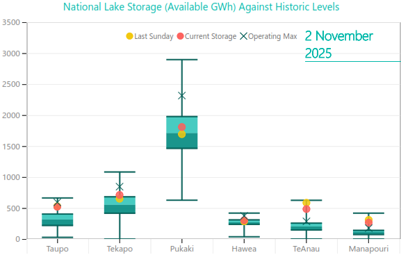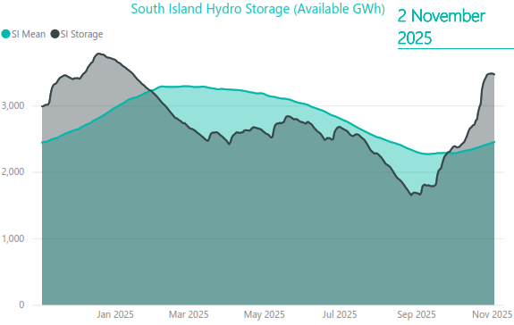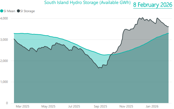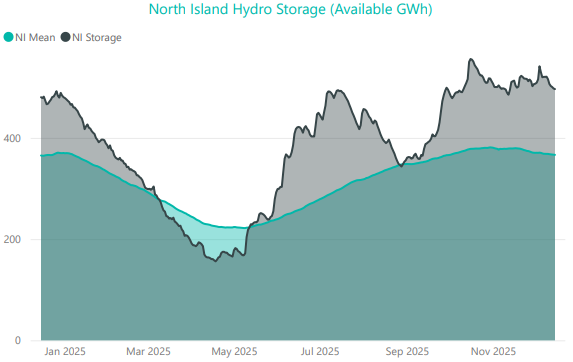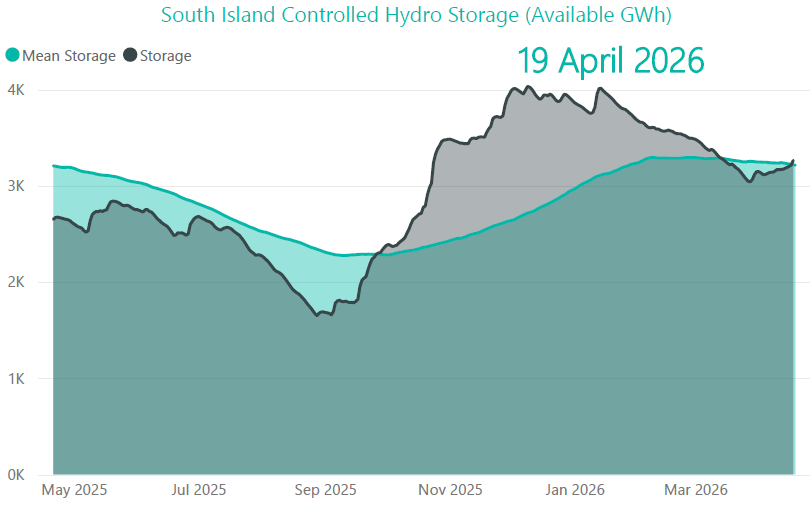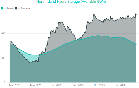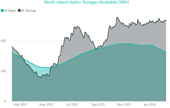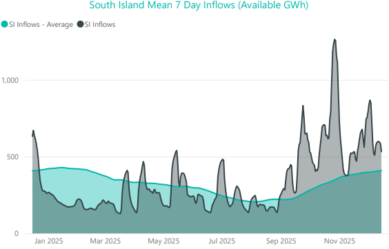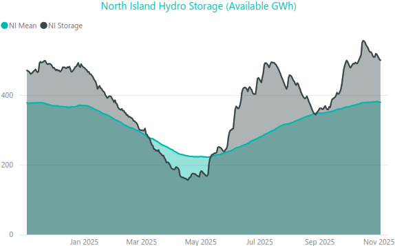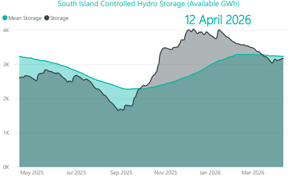The charts below show storage over the last 13 weeks and rolling 7 day inflows for the last year in North and South Islands.