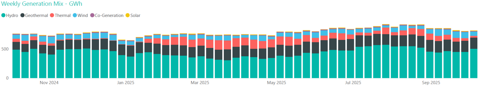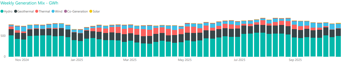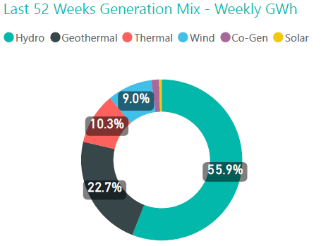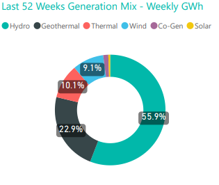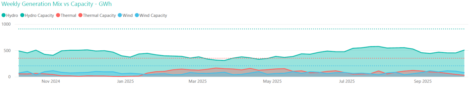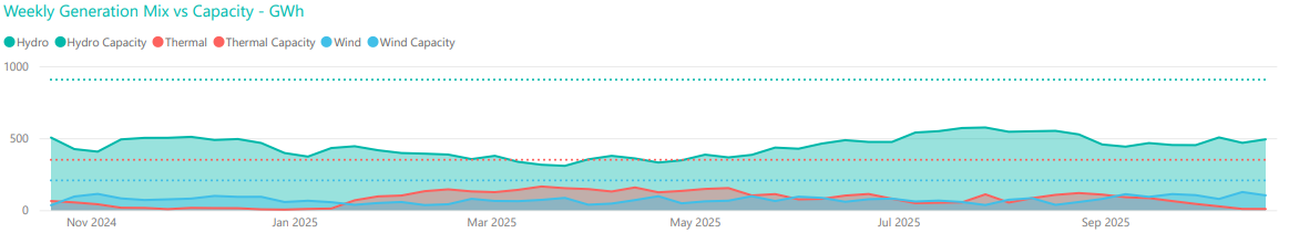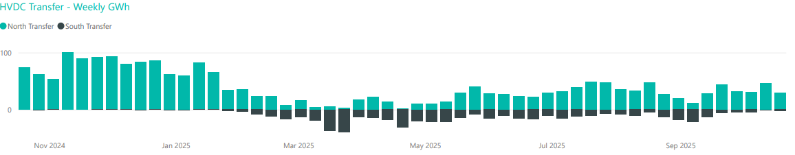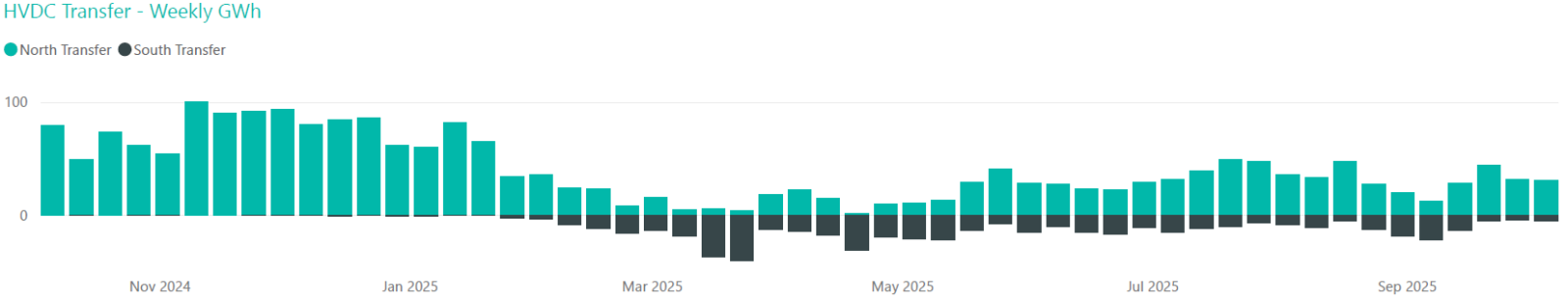 The ability to transfer electricity from one island to the other is an important aspect of managing security of supply, particularly as there are no thermal stations in the South Island to call upon in times of low hydro storage. Net weekly HVDC transfer is shown in the chart below with north transfer from Benmore to Haywards and south transfer in the opposite direction.