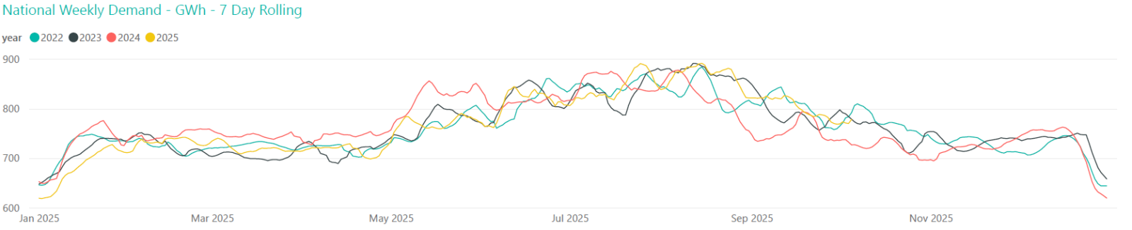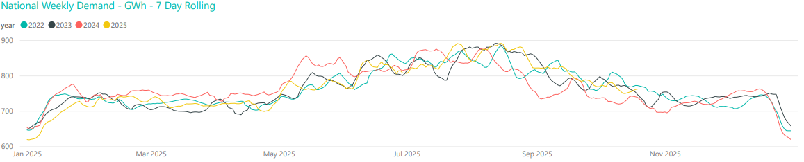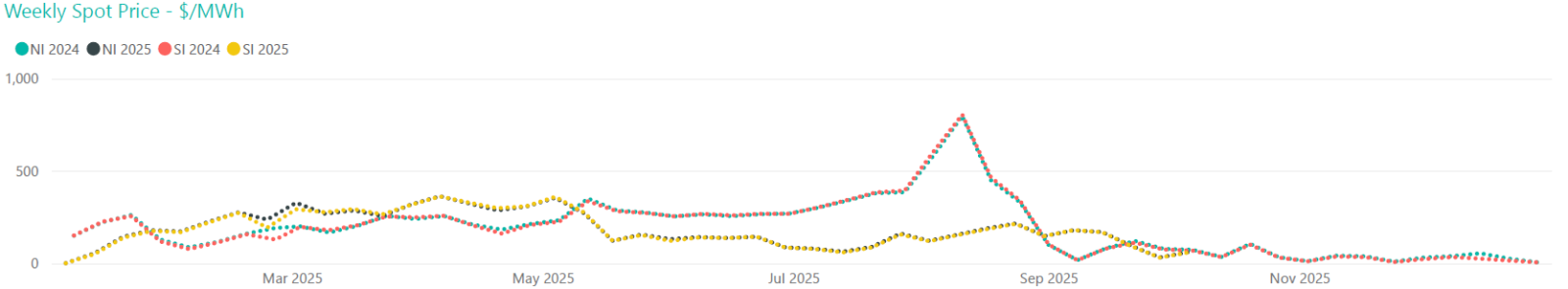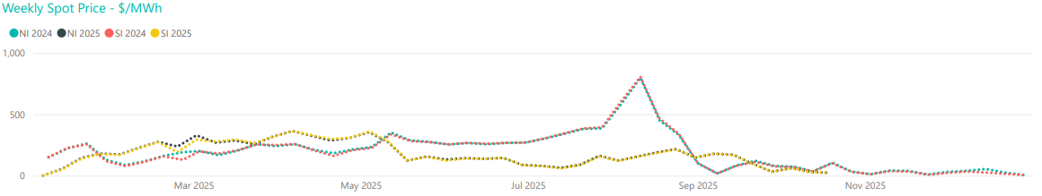 Spot prices can be an indicator of security of supply risk. Typically they rise when supply is tight, such as during 'dry years'. Weekly 7 day rolling spot prices for each island are shown in the graphs below. The corresponding prices for the previous year are also included for comparison.